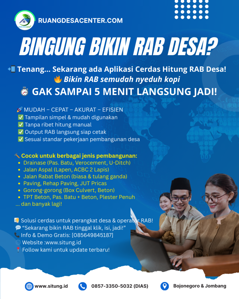 Jombang – Di tengah era digitalisasi pemerintahan desa, hadir sebuah terobosan teknologi yang siap mempermudah kerja perangkat desa dalam menyusun Rencana Anggaran Biaya (RAB) pembangunan. Sebuah aplikasi bernama “Situng - Aplikasi Cerdas RAB Desa” dikembangkan untuk menjadi solusi cepat, tepat, dan efisien dalam proses perencanaan pembangunan infrastruktur desa.